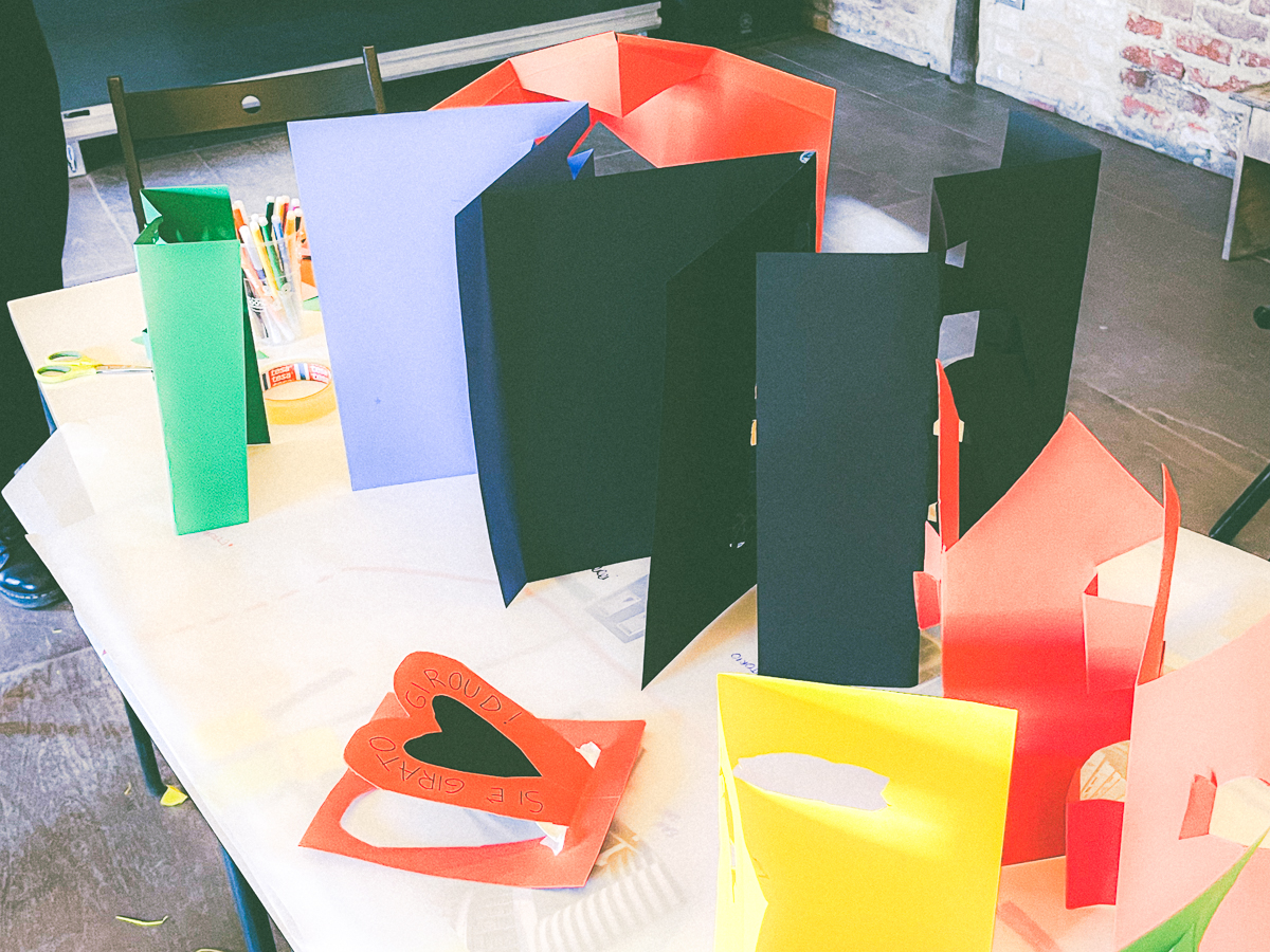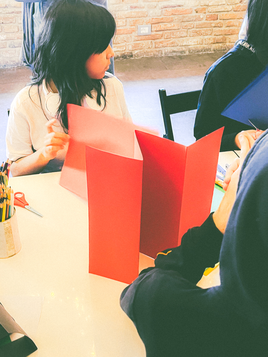 In the second laboratory, participants shaped and built abstract «travel sculptures» with colored cards, scissors, and markers, using the previous map as a foundation; indeed, these forms represent the most meaningful places and connections they’ve experienced within the community, capturing the spirit of each location they’ve chosen, anchoring these pieces to the map in ways that reflect their interactions and memories.
