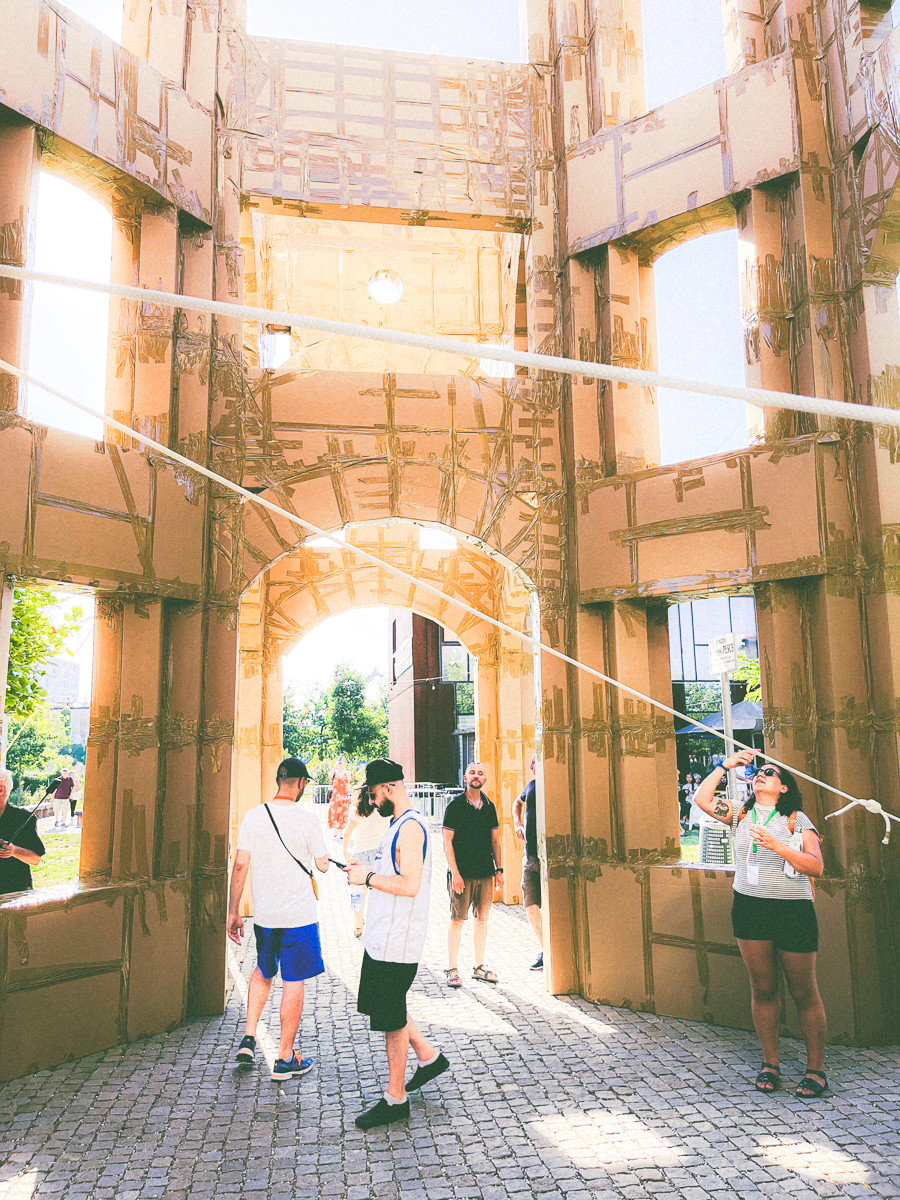 The next design phase, focused on developing a 3D prototype of the installation and constructing its various structural components, became a project within a project. Not only did we work on creating and refining the monumental artwork envisioned by artist Olivier Grossetete, but we also undertook the design and assembly of archetypes for arches, bases, portholes, and other elements, starting with simple rectangular cardboard boxes.